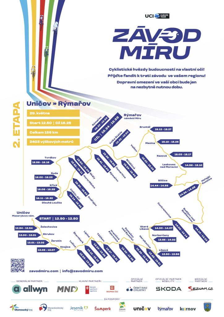 Více informací jako trasu závodu i časové rozmezí, kdy naší obcí peloton cyklistů projede, najdete na webu zavodmiru.com/cs/regiony.