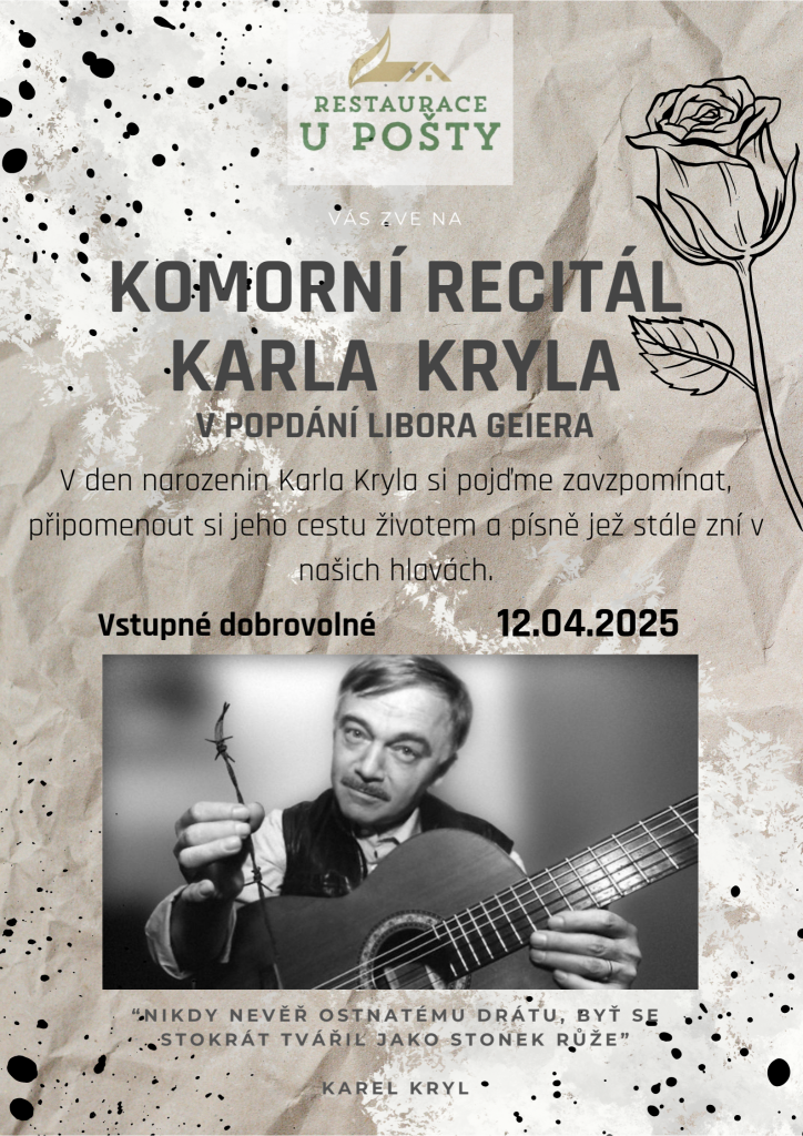Zveme vás na vzpomínkovou akci k poctě Karla Kryla, která se uskuteční v restauraci U pošty. Přijďte si poslechnout jeho hudbu a sdílet vzpomínky. Akce se koná v den výročí jeho narození.