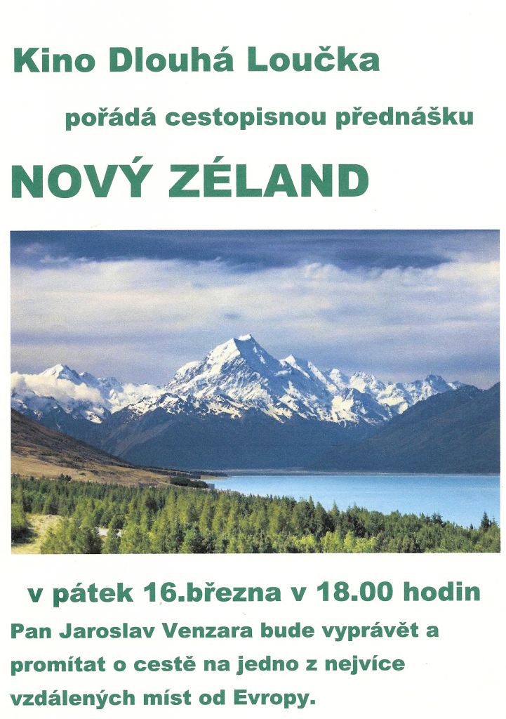 Nový Zéland, cestopisná přednáška s promítáním v místním kině. Přednášející pan Jaroslav Venzara.